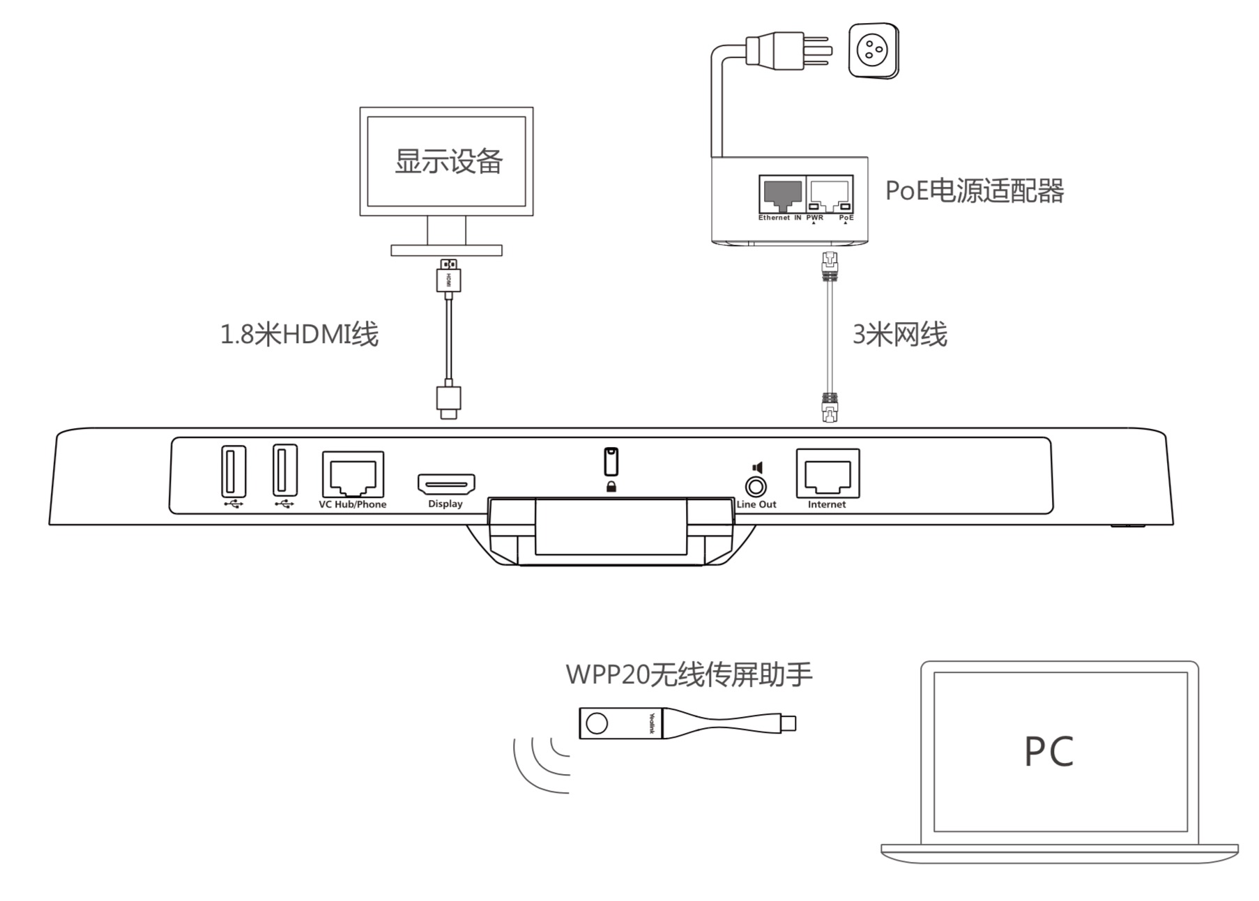• 1 x 亿联VCH接口 (RJ-45),可连接CP960或者VCH50 • 1 x 10/100M百兆网口 (支持IEEE802.3af PoE供电)
