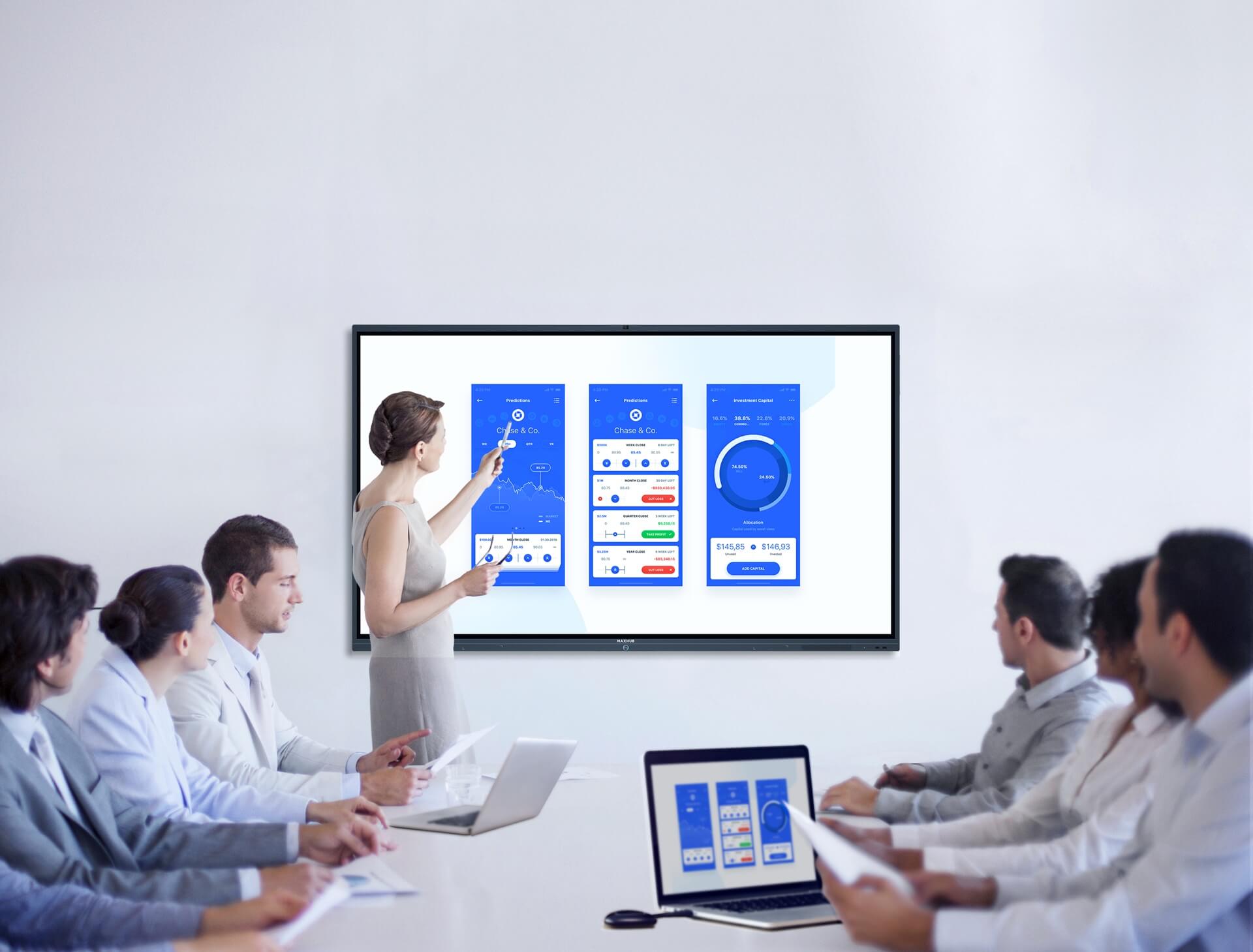 *多端连接指PC 端支持 Windows 7、macOS 10.10 及以上,手机、平板传屏支持 Android 5.0、 iOS 9.0 及以上操作系统。电脑可通过连接 MAXHUB 无线传屏器投屏,且第一次使用,无线传屏器需与会议平板配对;电脑、手机、平板可通过下载 MAXHUB 传屏助手APP实现投屏。